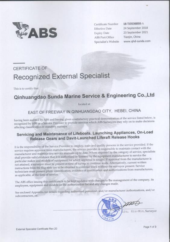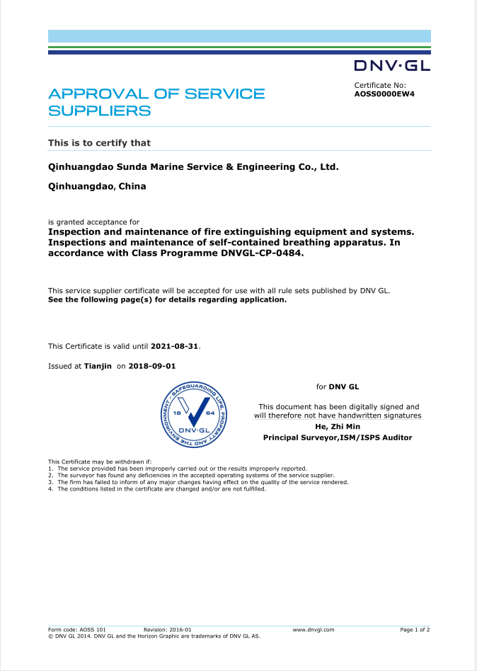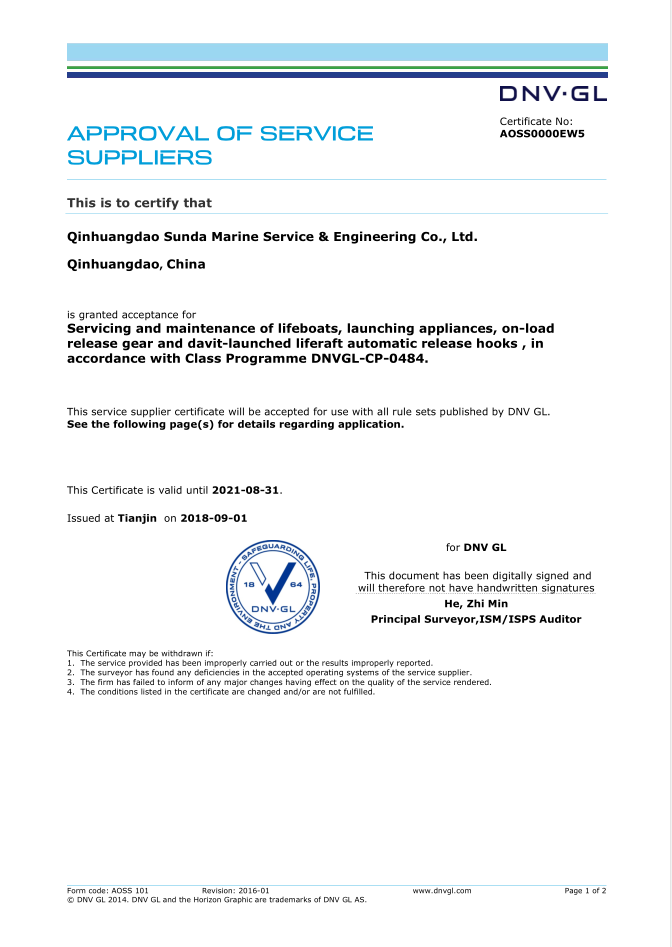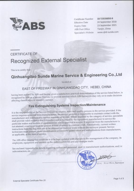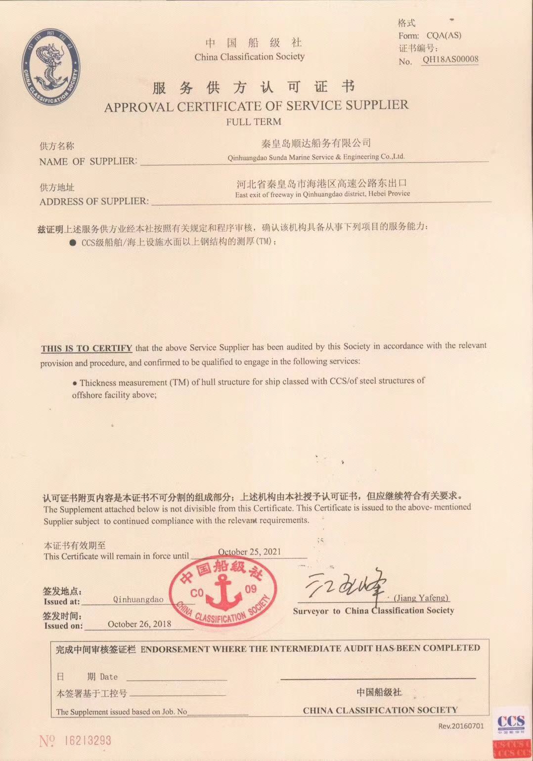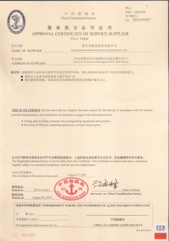 秦皇島順達(dá)船務(wù)有限公司位于美麗的海濱城市、中國北方著名的能源輸出大港--秦皇島。公司從事于船舶修理、物料供應(yīng)、水下檢測、船體測厚、消防救生設(shè)備及救生艇檢驗(yàn)、電氣自動化修理等服務(wù)。 公司自1997年成立至今,先后為國內(nèi)外船東修理、檢驗(yàn)各類船舶萬余艘,積累了豐富的施工經(jīng)驗(yàn)。公司現(xiàn)有場地100余畝,員工30余人,以及工程用車若干臺。我們公司一直本著嚴(yán)以律己、真誠待人、精益求精、信譽(yù)至上的經(jīng)營理念,以優(yōu)質(zhì)的服務(wù)、專業(yè)的施工、合理的收費(fèi),得到了國內(nèi)外船東的廣泛認(rèn)可,贏得了良好的口碑和信譽(yù)。 公司已取得了中國船級社(CCS)、美國船級社(ABS)、日本船級社(NK)、德國船級社(DNV GL)等各個(gè)船級社的消防救生和救生艇檢驗(yàn)資質(zhì), ...